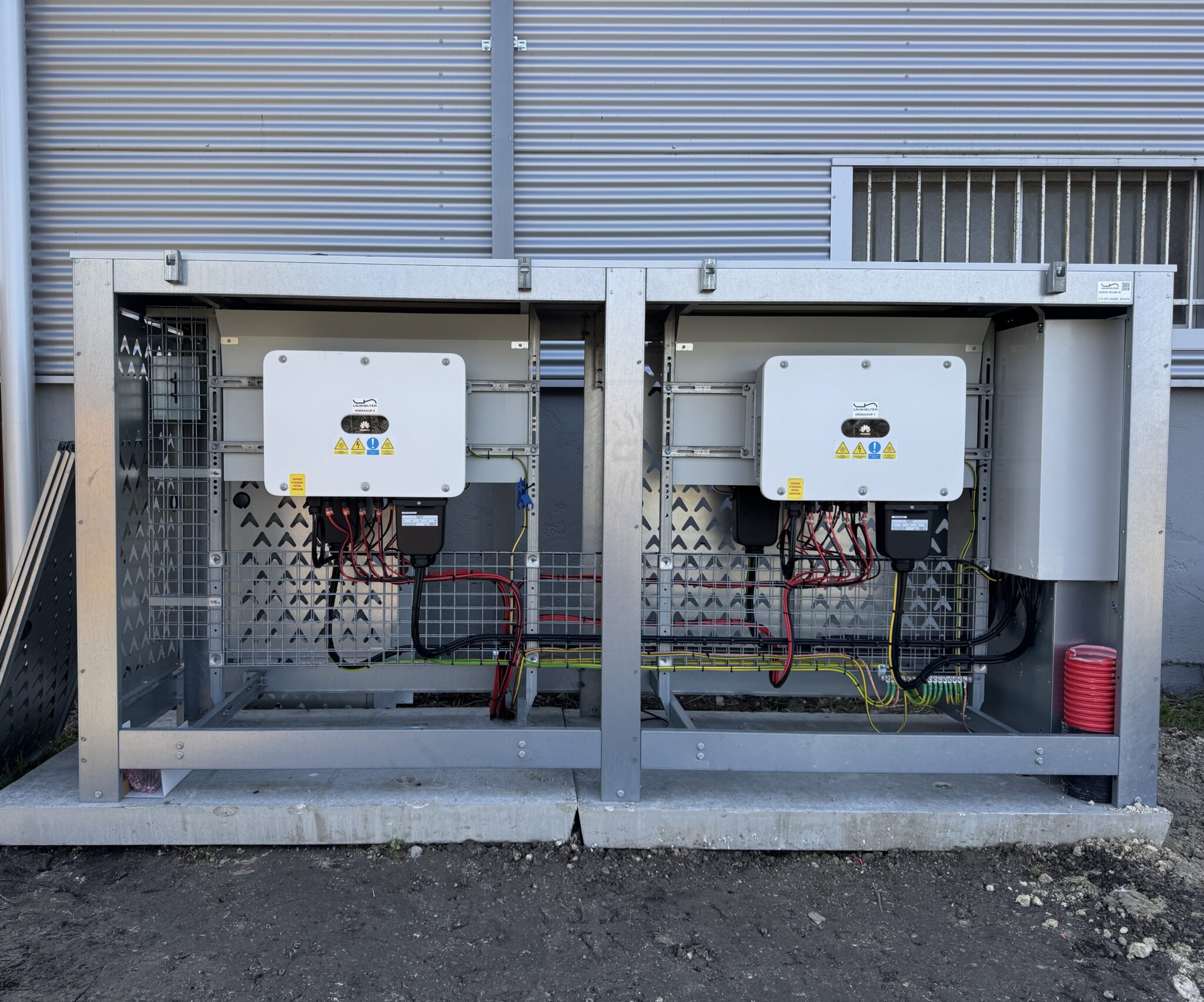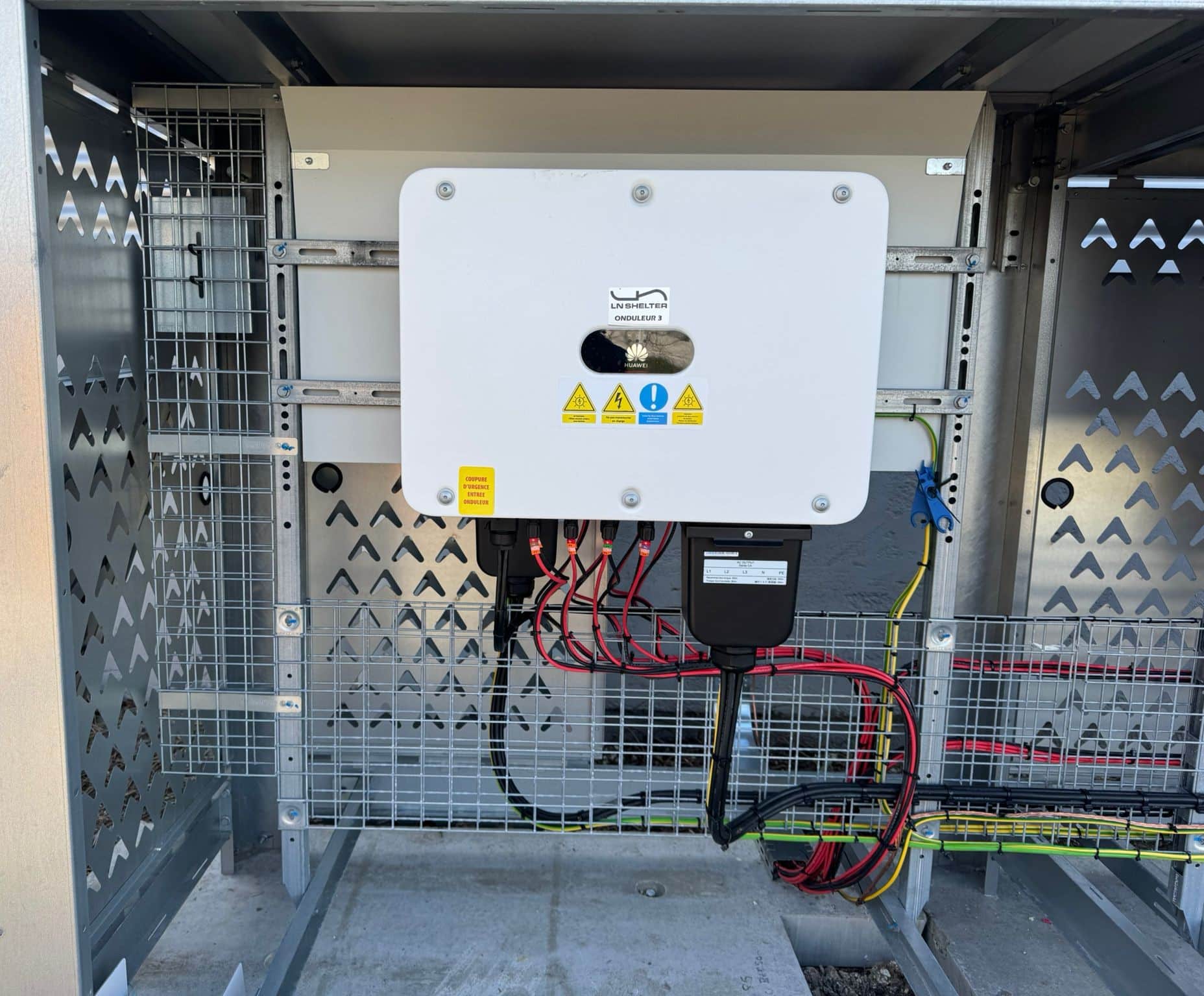 Nous avons également installé un shelter technique intégrant 4 onduleurs centralisés HUAWEI.
